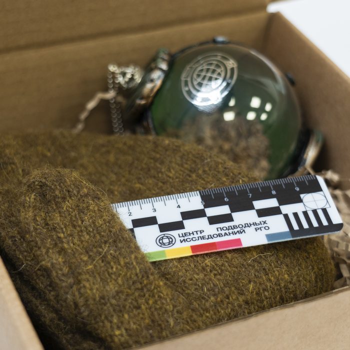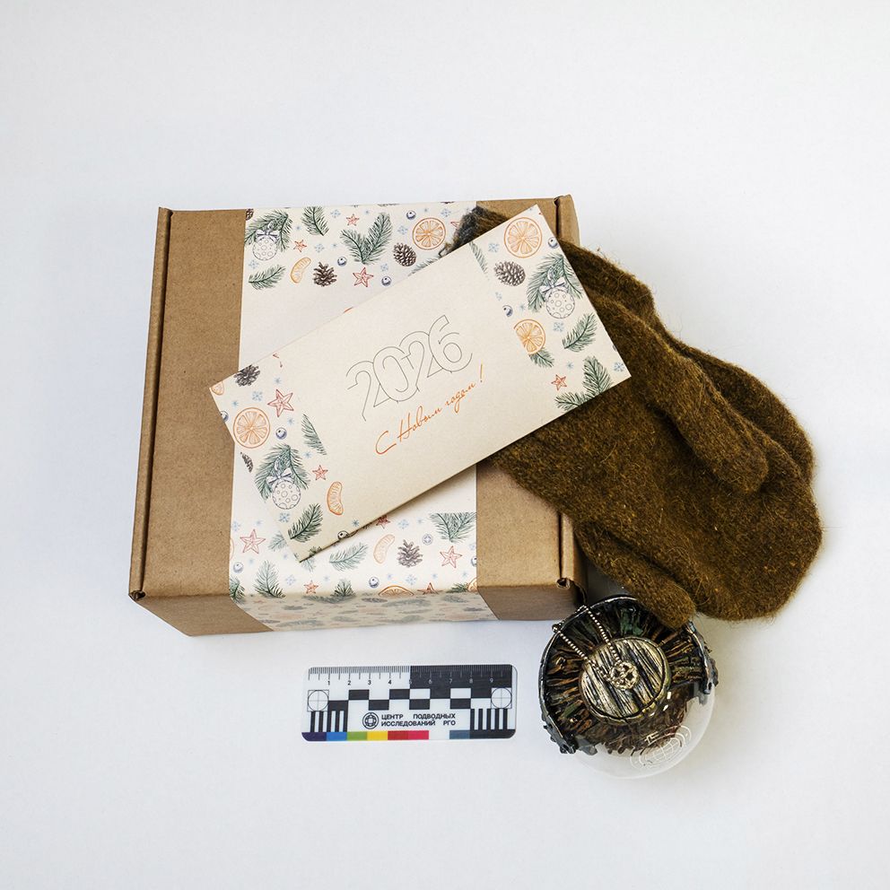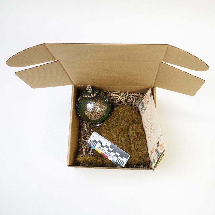 Необычный подарочный набор, в который входит ёлочная игрушка — Шар с 300-летним зерном с «Архангела Рафаила», Рукавица двупалая шерстяная с «Архангела Рафаила», археологическая линейка, открытка-конверт с бенгальскими огнями.