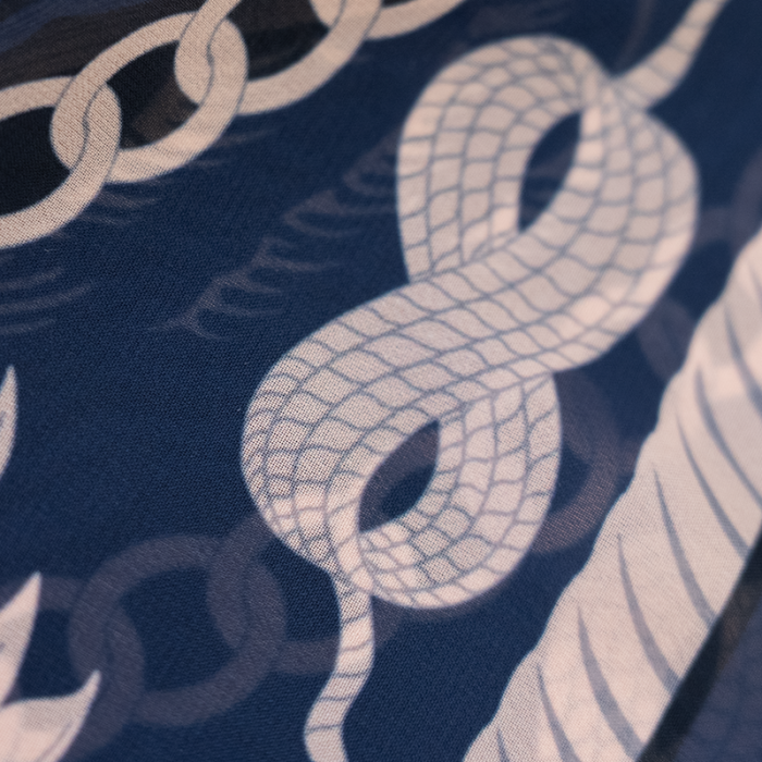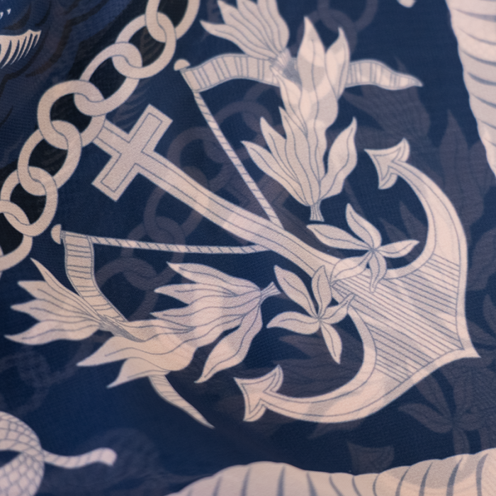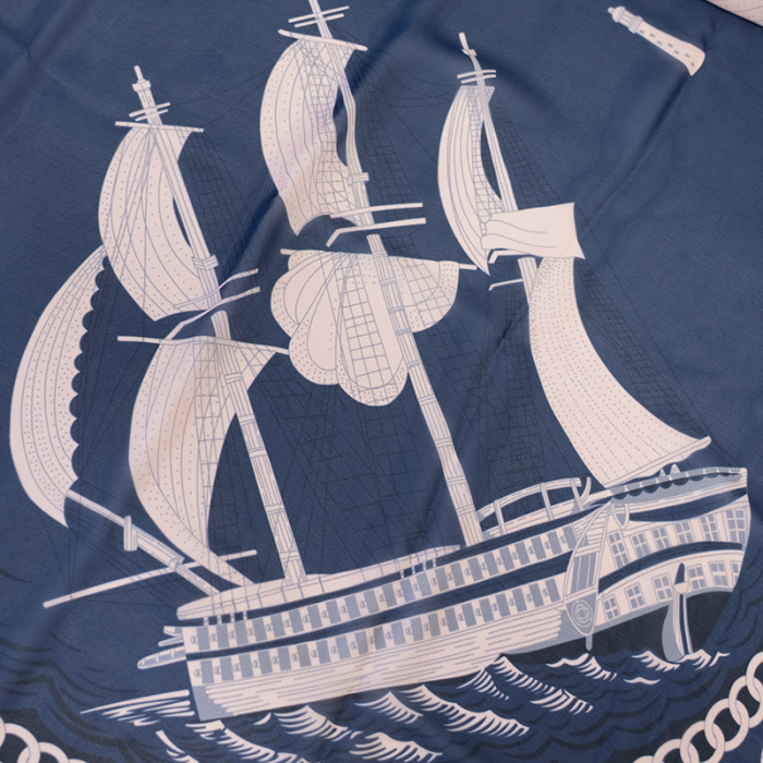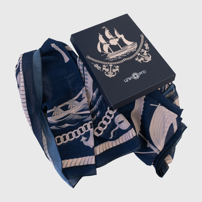 Реплика платка с парусниками в подарочной упаковке. Точная копия уникального артефакта, обнаруженного в 2019 году на борту английского кеча XIX века, в ходе экспедиции «Гогланд. Акватория». Исполнена в синем цвете. Состав: шифон, 100% полиэстер.
