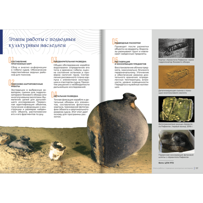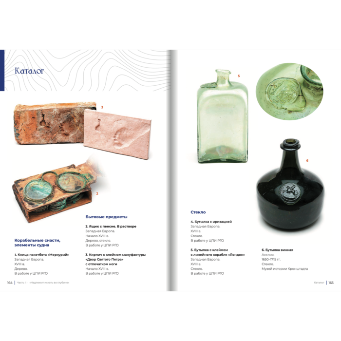 Каталог выставки подлинных предметов корабельного быта начала XVIII века, поднятых с затонувших в Балтийском море торговых судов и военных кораблей. Проект приурочен к 350-летию со дня рождения Петра Великого, царя-реформатора, основателя Санкт-Петербурга и создателя российского флота. Культурное и историческое наследие петровской эпохи сохранилось, прежде всего, в виде немногих уникальных предметов царского и аристократического обихода. Узнать больше о повседневной жизни того времени помогает подводная археология, которая находит и поднимает с морских глубин артефакты, которыми несколько сотен лет назад пользовались ежедневно. Многие из представленных в каталоге экспонатов существуют в России и в мире в единственном экземпляре. В издании собраны научно-публицистические материалы, посвященные истории и бытованию гражданского и военного флотов петровской эпохи, а также методике подводных исследований и реставрации предметов того времени.
